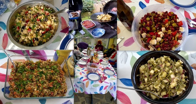 Mukava yhdessäolo jatkui syönnin merkeissä. Jokainen toi mukanaan salaattia. Oli kaksi erilaista couscussalaattia, talonpoikasisalaattia ja perunasalaattia. Talonväki grillasi kyljyksiä, kananrintaa ja halloumijuustoa. Lisukkeena perunaa ja yrttijugurttikastiketta. Tarjolla oli valkoviiniä, olutta ja vettä.